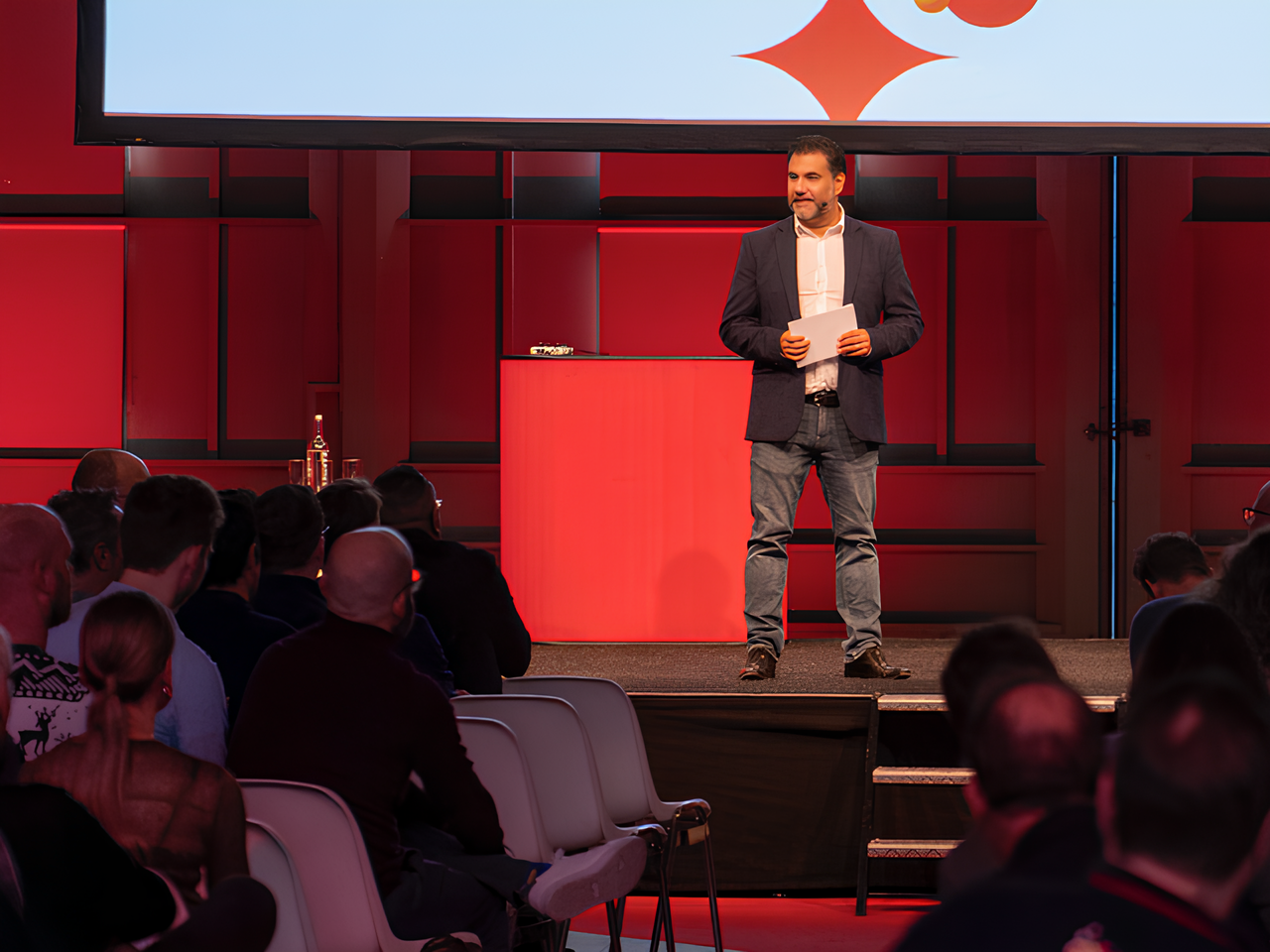 We start with a fun warm-up to get people out of their heads. After that, we explain the simple rules and give one or two demo presentations so everyone knows what to expect. Then it’s the audience’s turn: they make slide decks for each other or practise together as a group. And finally the big finale: volunteers go on stage and give a real PowerPoint-Karaoke presentation.