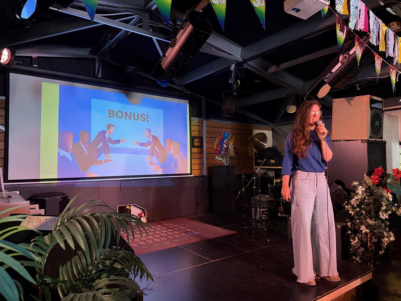 We met on the Dutch comedy circuit and quickly discovered our shared love for the beautiful chaos of improvisation. Paul knew I was working as a presenter and presentation trainer, so he reached out with the idea of organising PowerPoint Karaoke sessions. At the very first test event, he performed with Aniek, and that’s when everything really took off.